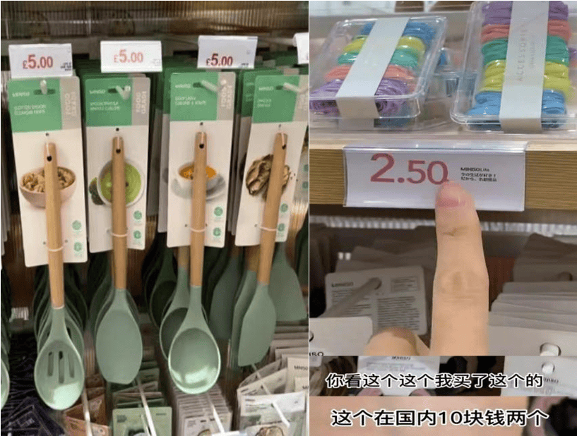 在英國倫敦,有小紅書和b站up主發現,名創優品的普通勺子售價5鎊,也就是人民幣46元;簡單發繩2.5鎊,約合人民幣23元,“國內兩盒只要10元”