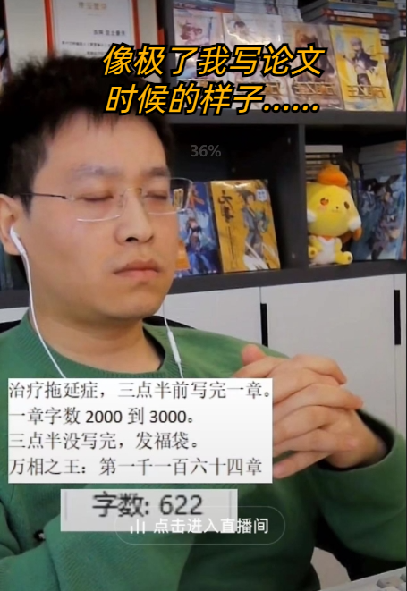 在萬人圍觀的直播間裏,天蠶土豆手指翻飛一頓操作,勤勤懇懇刪刪改改,半小時後字數卻回到了最初的起點。卡頓得久了,他便不動手只動嘴,時而喝茶吃飯嗑瓜子,時而輪番品嚐各式水果,迎着彈幕的催促聲假裝忙碌,直到靈感到來時再一陣爆更趕進度……