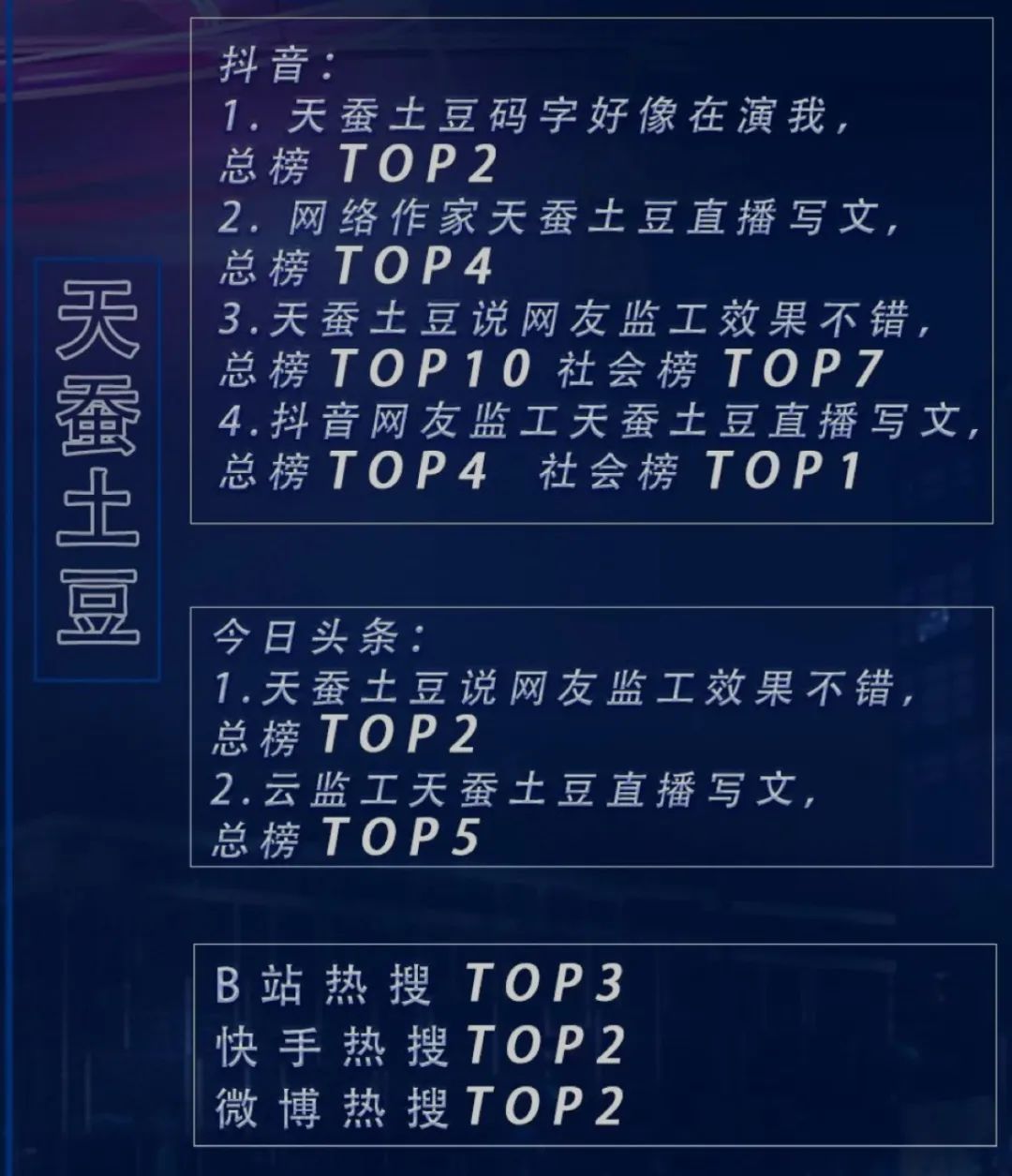 開啓直播以來,天蠶土豆的抖音賬號粉絲量大幅提升,最近發佈的短視頻互動數據數倍於過去,更新中的作品《萬相之王》也獲得了更高的市場關注度。開播不到一週,《萬相之王》便同步登上了百度熱搜小説榜和起點讀書熱搜榜的雙榜榜首。