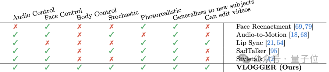 而和業內此前的同類方法相比,VLOGGER最大的優勢則體現在不需要對每個人進行訓練、也不依賴於面部檢測和裁剪,並且生成的視頻很完整(既包括面部和唇部,也包括肢體動作)等等。