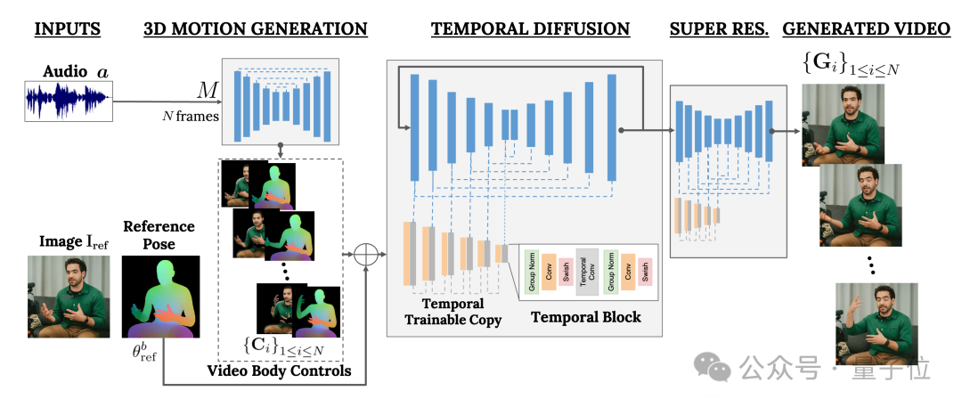 其中,前者負責將音頻波形作為輸入,生成人物的身體控制動作,包括眼神、表情和手勢、身體整體姿勢等等。