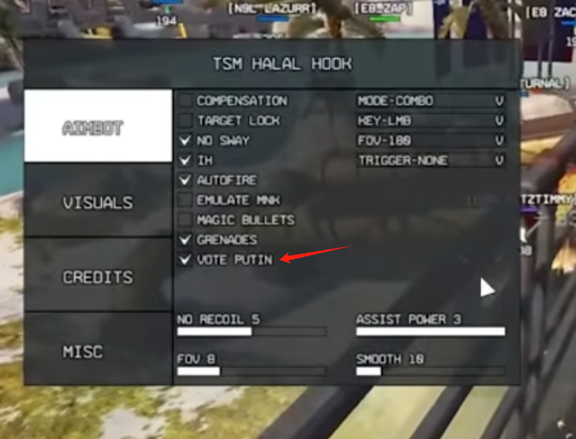 因為 Gen “ 被開掛 ” 的時候,出現過一個外掛界面,上面有個選項叫 “ Vote Putin ” ( 給普京投票 )。