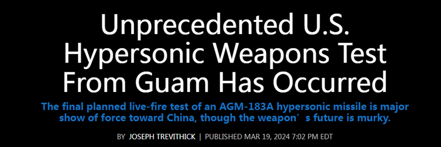 美國《星條旗報》透露,美國空軍B-52H轟炸機掛載一枚AGM-183A高超音速導彈從具有戰略意義的太平洋中部島嶼——關島安德森空軍基地起飛,實施該項目的最後一次計劃內試射。日本戰略研究論壇高級研究員、退役美國海軍陸戰隊上校格蘭特•紐瑟姆稱,一旦高超音速導彈投入使用,將為美軍提供難以攔截的武器,它們可以在緊急情況下用於打擊中國目標。美國“動力”網站也吹噓説,這是美國首次在本土以外測試高超音速武器,選擇在這裏是向太平洋彼岸的中國進行武力示威。
