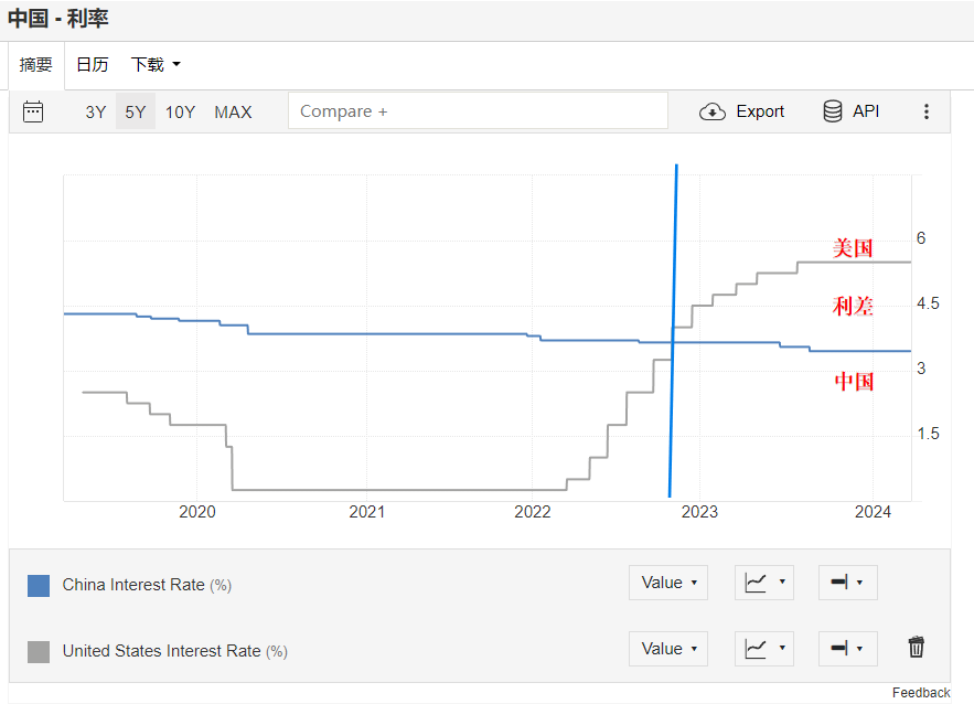 就是因為現在美國的基準利率已經達到5.5%了,如果這個時候中國再降息,那麼美元和人民幣的利差將進一步加大,這樣一來,一些大資本就會把人民幣換成美元去“套利”。這就是所謂的“資本外流”。