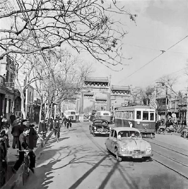 ▼西四牌樓北向,有軌電車通過北大市街牌樓,畫面左側是轉角樓新華書店朝東的鋪面房。