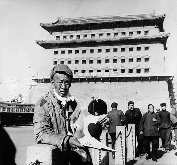 ▼正陽門箭樓南面,兜售報紙的老人手拿《北京日報》。箭樓上有橫幅“蘇聯電影節”。