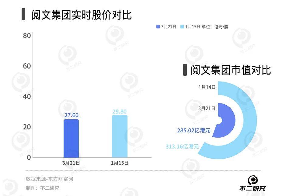 截至3月20日收盤,閲文報收27.60港元/股,對應市值282.5億港元(約摺合人民幣260.06億元);對比今年1月的市值高點313.16億港元,其市值已經蒸發30.66億港元(約摺合人民幣28.22億元)。