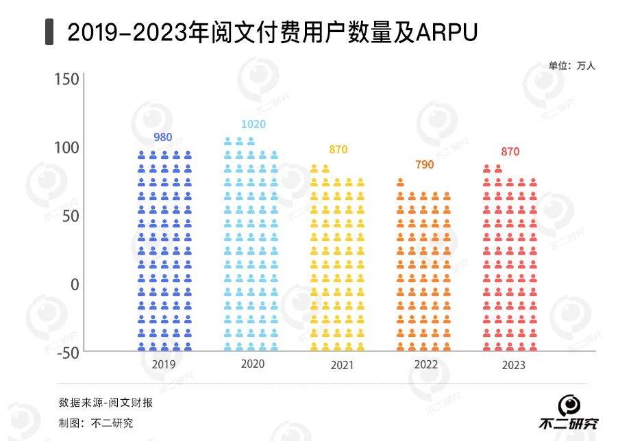 據歷年年報數據,2019-2023年,閲文集團付費閲讀平均月付費用户數量分別為980萬、1020萬、870萬、790萬和870萬,ARPU分別為25.3元、34.7元、39.7元、37.8元和32.5元。