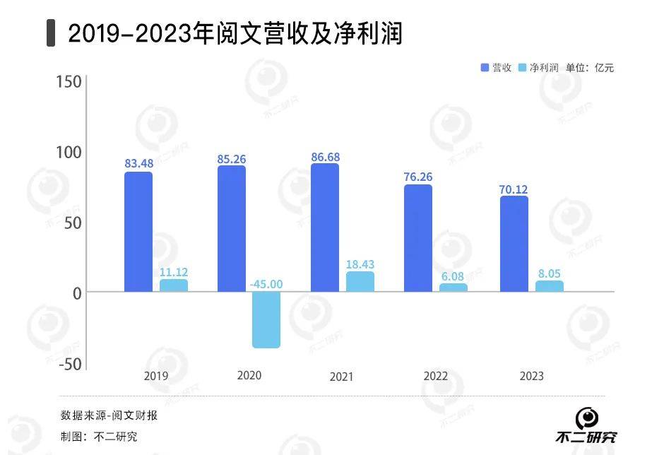 「不二研究」據其年報發現,2023年,閲文實現收入70.12億元,同比下降8%;淨利潤為8.05億元,同比增加32.3%。