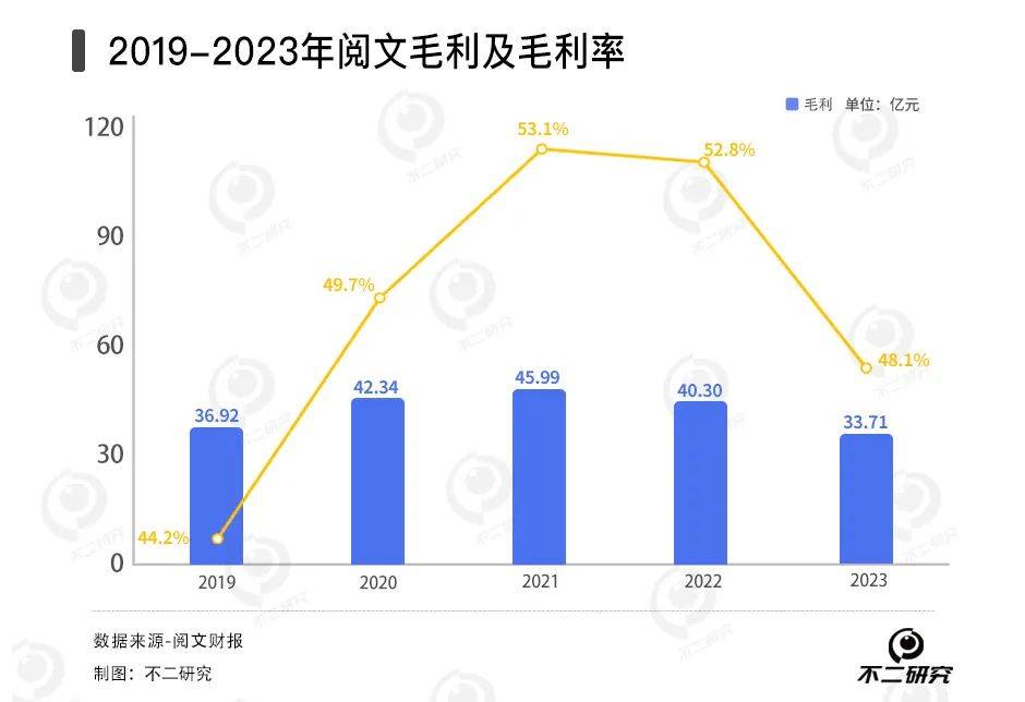 對比往年數據,2019-2023年財報顯示,閲文毛利分別為36.92億元、42.34億元、45.99億元、40.30億元和33.71億元,其中2023年同比下降16.3%;毛利率分別為44.2%、49.7%、53.1%、52.8%和48.1%,其中2023年同比下降48.1%。
