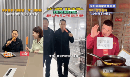 從員工到老闆紛紛展現出求生欲,用直播吃澱粉腸的方式證明自家產品沒問題。