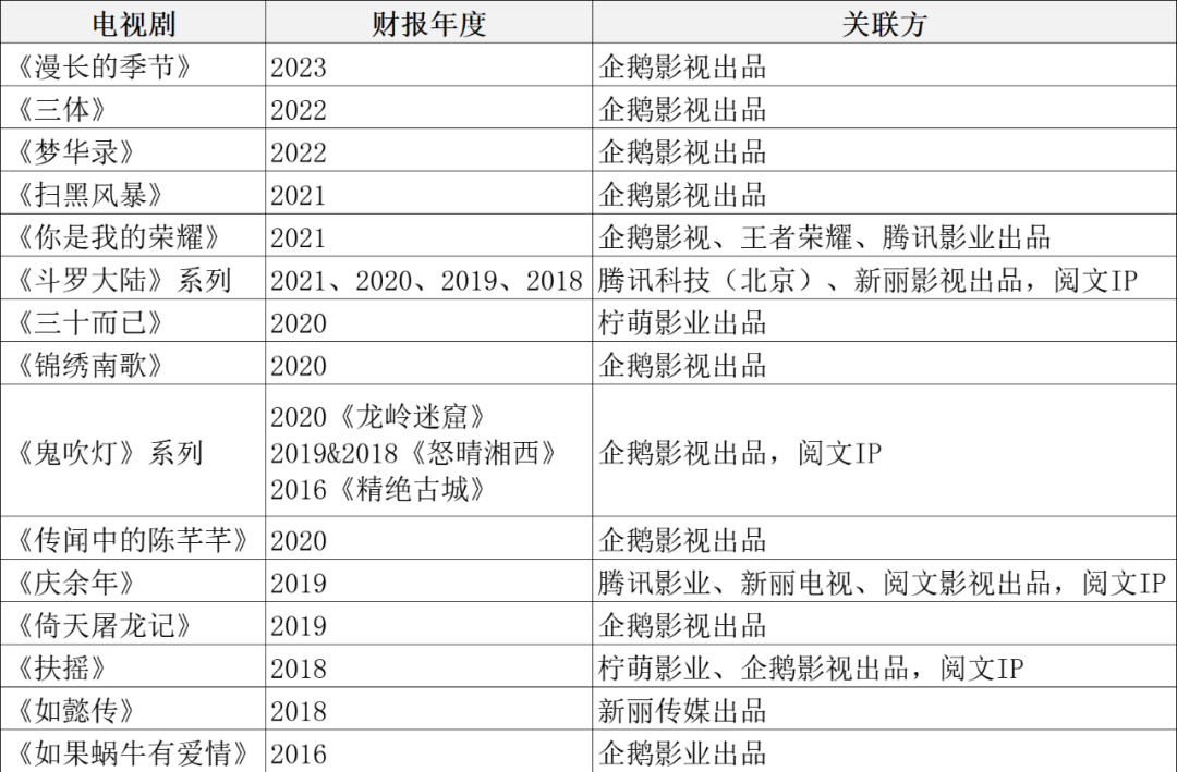 注:以上表格中,企鵝影視、閲文為騰訊子公司,新麗為閲文子公司,檸萌影業為騰訊投資企業。