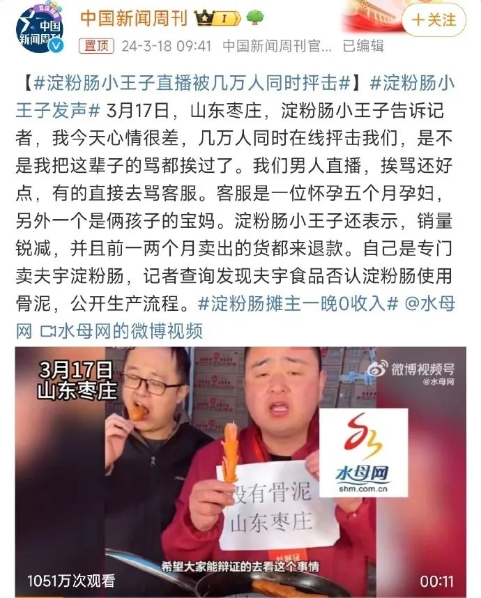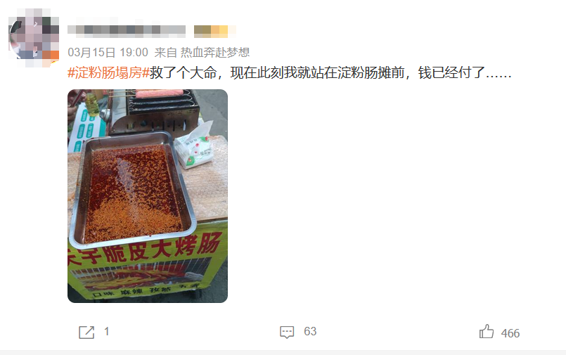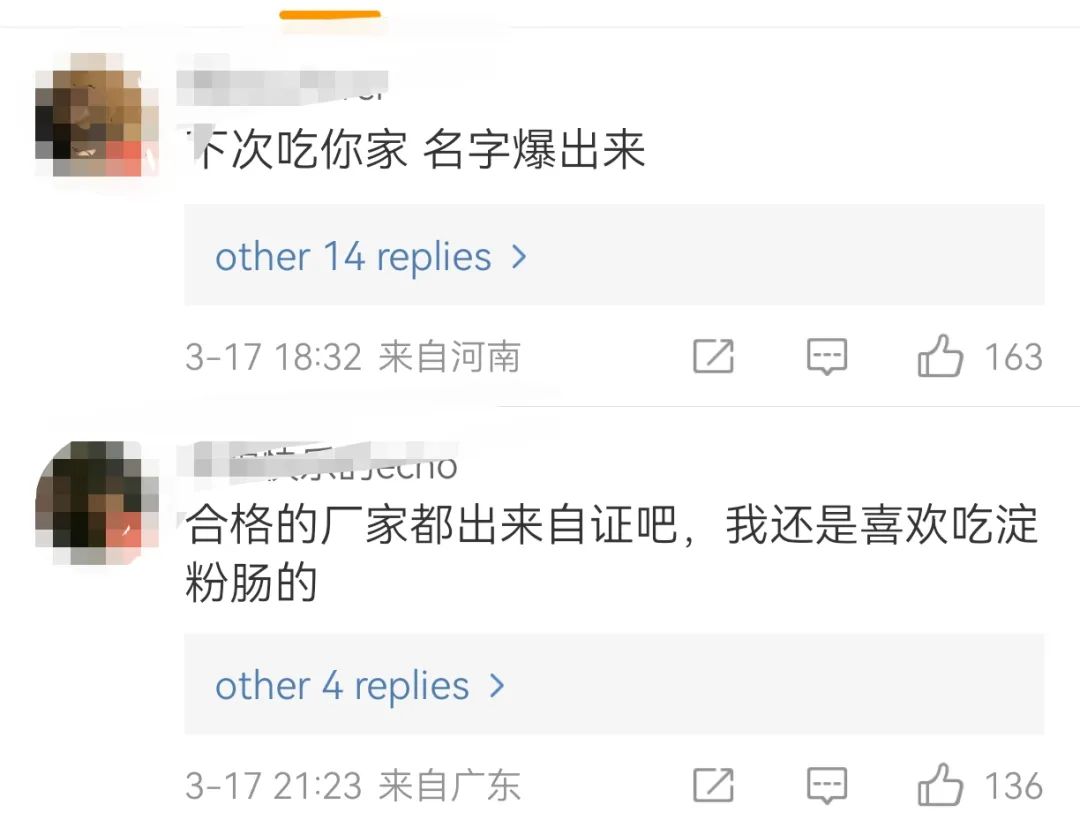 來自年輕人的巨大聲量,輕輕鬆鬆蓋過了其它所有315晚會上被點名的對象,一晚上過後,全網都只記住了澱粉腸不能吃了,於是真正的受害者這時才出現了——攤販、廠商。