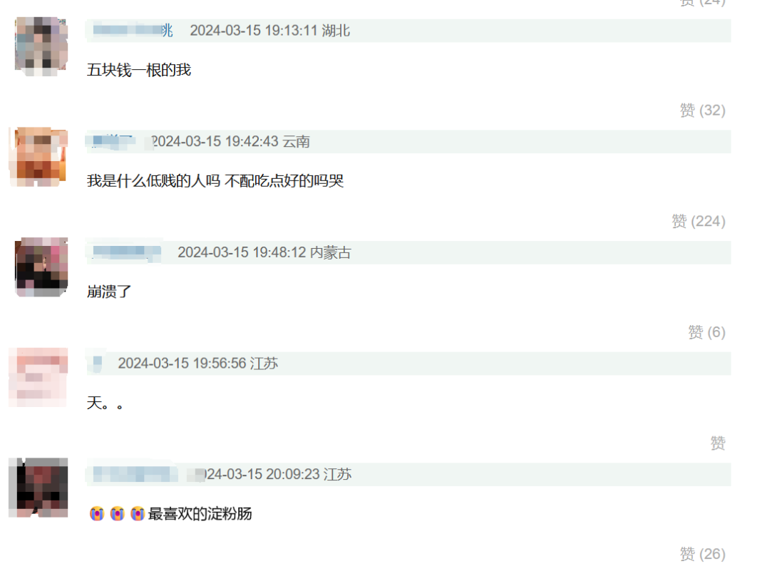 當天晚上,一半以上的中國網友都跟我一樣難以安眠。那可是澱粉腸啊!曾經校門口小吃街的唯一真神,當代地鐵口路邊攤的天下霸主!西方不能失去耶路撒冷,就像中國小吃界絕對不能失去澱粉腸——至少在2024年3月15日之前的年輕人心中是這樣的。
