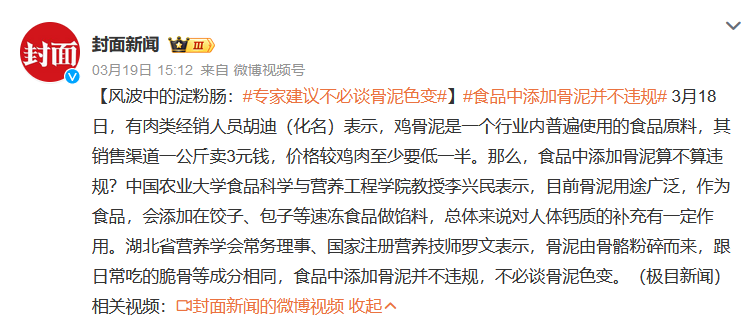 很快,曾經得出結論説骨泥對人體有害的“專家”又上了一次熱搜,只不過這次説的是**“經規範養殖、加工的骨泥可食用”。**