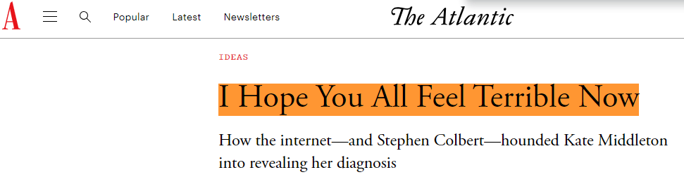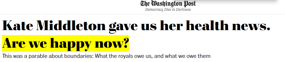**In case you have been living under the heaviest, most remote rock in the world,**Kate underwent surgery in January and announced a months-long retreat from public life to recover. That story didn’t sit well with the public or the media, and they came up with9,234,923,089other reasons for her absence.(USA Today)