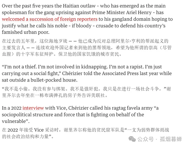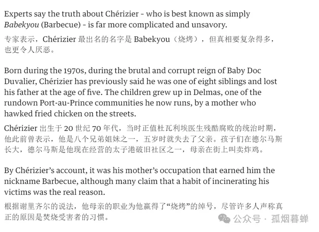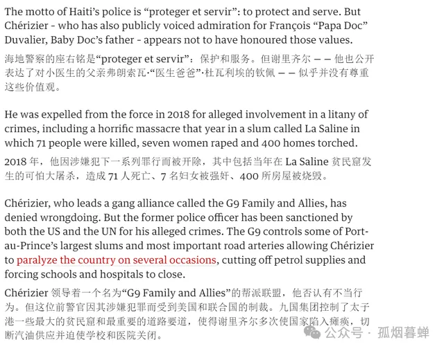“2018 年,謝里齊爾因涉嫌犯下一系列罪行,而被海地警察部隊開除。當年,謝里齊爾在太子港的拉·薩林貧民窟裏製造了一起慘絕人寰的大屠殺,造成至少71人死亡、7名婦女遭到強姦、另有400多所房屋被燒燬。而這,這不過是謝里齊爾所犯下的諸多暴行裏的其中一樁。”