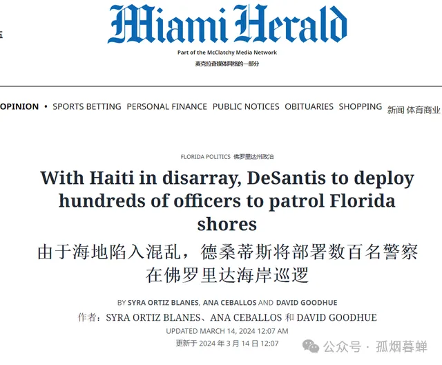 眼看着民主黨人控制的聯邦政府靠不住了,佛州的共和黨政府只好自謀出路。據佛州媒體《邁阿密先驅報》報道,當地時間3月13日,佛州州長德桑蒂斯親自作出指示,表示將派遣數百名執法人員和國民警衞隊士兵趕赴佛州南部海岸巡邏,攔截打擊非法偷渡船隻,尤其是那些載着“因為幫派戰爭而大量外逃,絕望無助的海地人”的偷渡船隻。