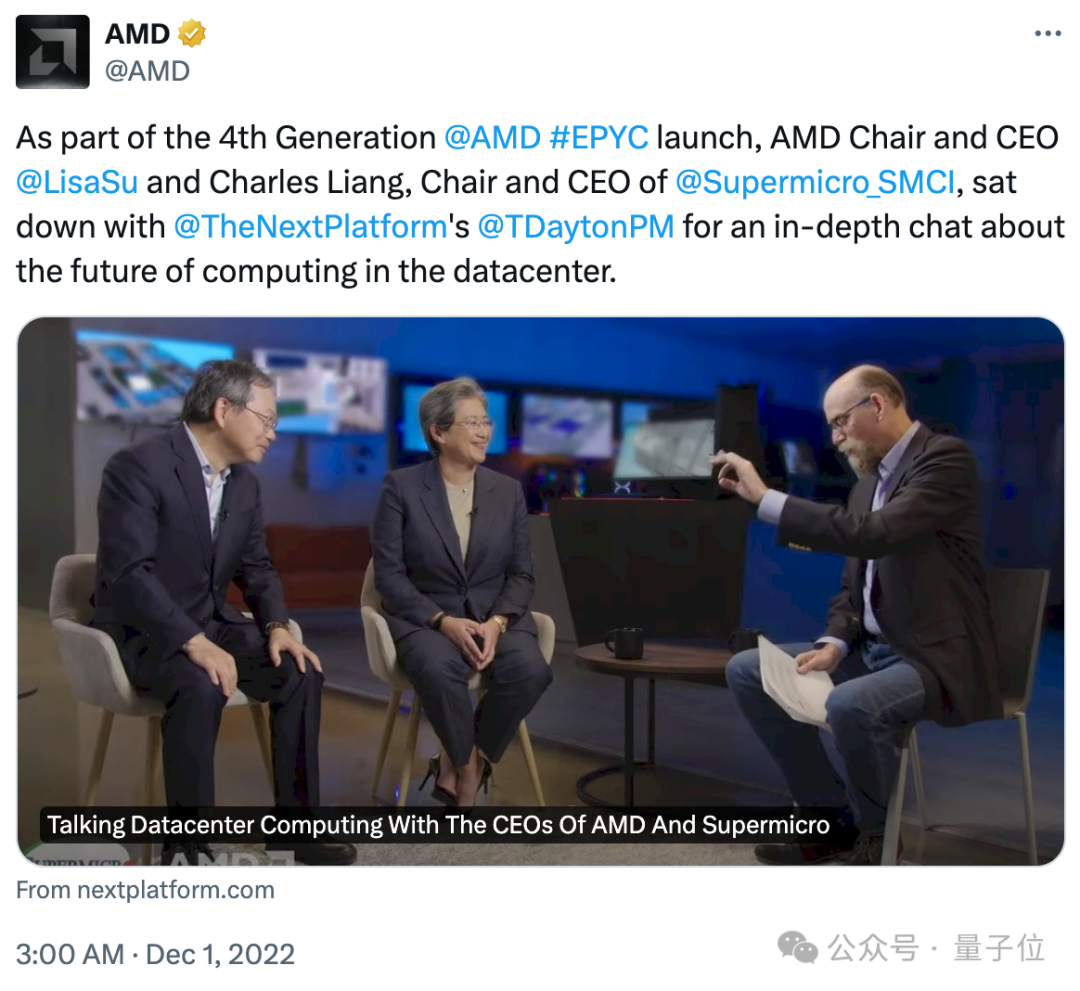 去年12月,AMD發佈對標H100的GPU“Instinct MI300X GPU”時,蘇媽就找來梁見後一起大談數據中心未來。