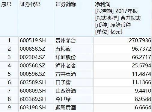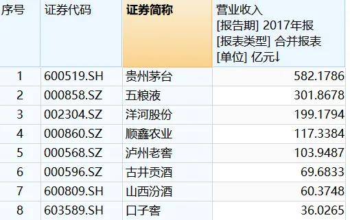 以公司2017年的營收對比,Wind數據顯示,A股白酒上市公司中,貴州茅台、五糧液、洋河股份、順鑫農業、瀘州老窖、古井貢酒、山西汾酒和口子窖共8家企業都已超過31.70億元。淨利潤方面,有9家公司超過了西鳳酒。