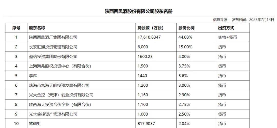 本次增資擴股前,西鳳酒的註冊資本為4億元,前三大股東分別為陝西西鳳酒廠集團(44.03%)、長安匯通(15%)、盈信投資集團(4%)。