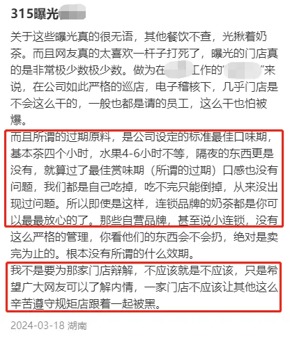 上述湖北某品牌加盟商就在網上發文:“新聞報道中的所説的過期原料,其實是公司設定的標準最佳賞味期,一般茶是4個小時,水果4~6小時不等。過了賞味期的食材並不是壞了,我們一般會自己吃掉,吃不完就只能倒掉。”