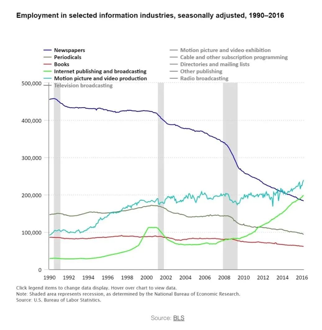 儘管傳統出版業的衰落有一部分歸咎於互聯網的發展,但數字出版的增長量並不能填補傳統新聞、書籍和雜誌下降的缺口: