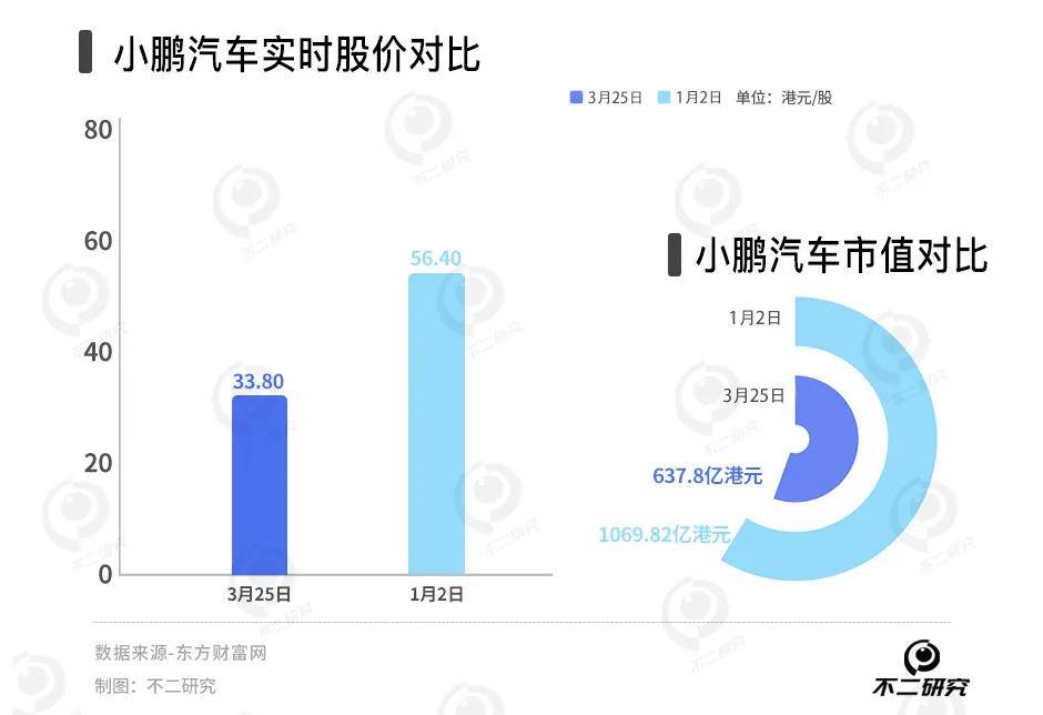 截至3月25日港股收盤,小鵬汽車報收33.80港元/股,對應市值637.8億港元(約摺合人民幣587.60億元);對比1月的市值高點1069.82億港元,其市值已蒸發417.92億港元。