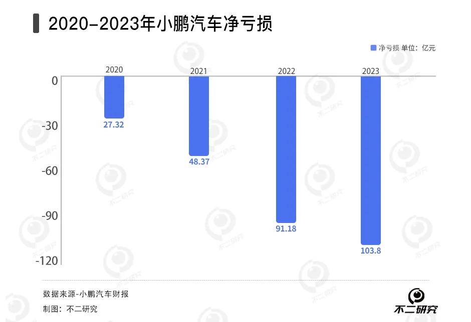 據小鵬財報顯示,其盈利能力不容樂觀:2020-2023年,其淨虧損分別為27.32元48.37億元、91.18億元、103.8億元,近四年累積淨虧損243.35億元。
