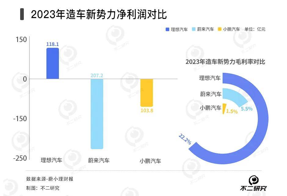 從淨利潤來看,造車新勢力三巨頭中, 2023年蔚來淨利潤為-207.20億元,理想淨虧損118.1億元,小鵬則為-103.8億元。