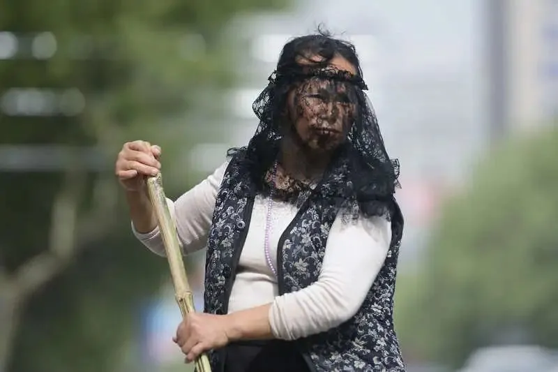 2017年4月18日,浙江省嘉興市中山路,來自四川的環衞工楊大姐戴着自制的“面具”清潔馬路。楊大姐花粉過敏,手臂上很癢,“春天柳絮太多了,自己做的這個面罩,能遮住臉和脖子,會好很多。”視覺中國供圖