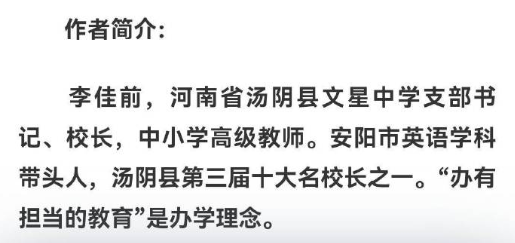 網友們扒拉了一下,**發現該小説的作者名叫“李佳前”,是河南省湯陰縣文星中學支部書記,被評選過“湯陰縣第三屆十大名校長之一”。**説實話,這個名頭有點太低了。如果不是這篇小説被選入成都新都區初三年級語文測試,可能沒幾個人會認識他。在一個常規縣,都不一定能湊出十所中學,而李佳前被評為湯陰縣十大名校長,這完全就是一個虛假的榮譽。