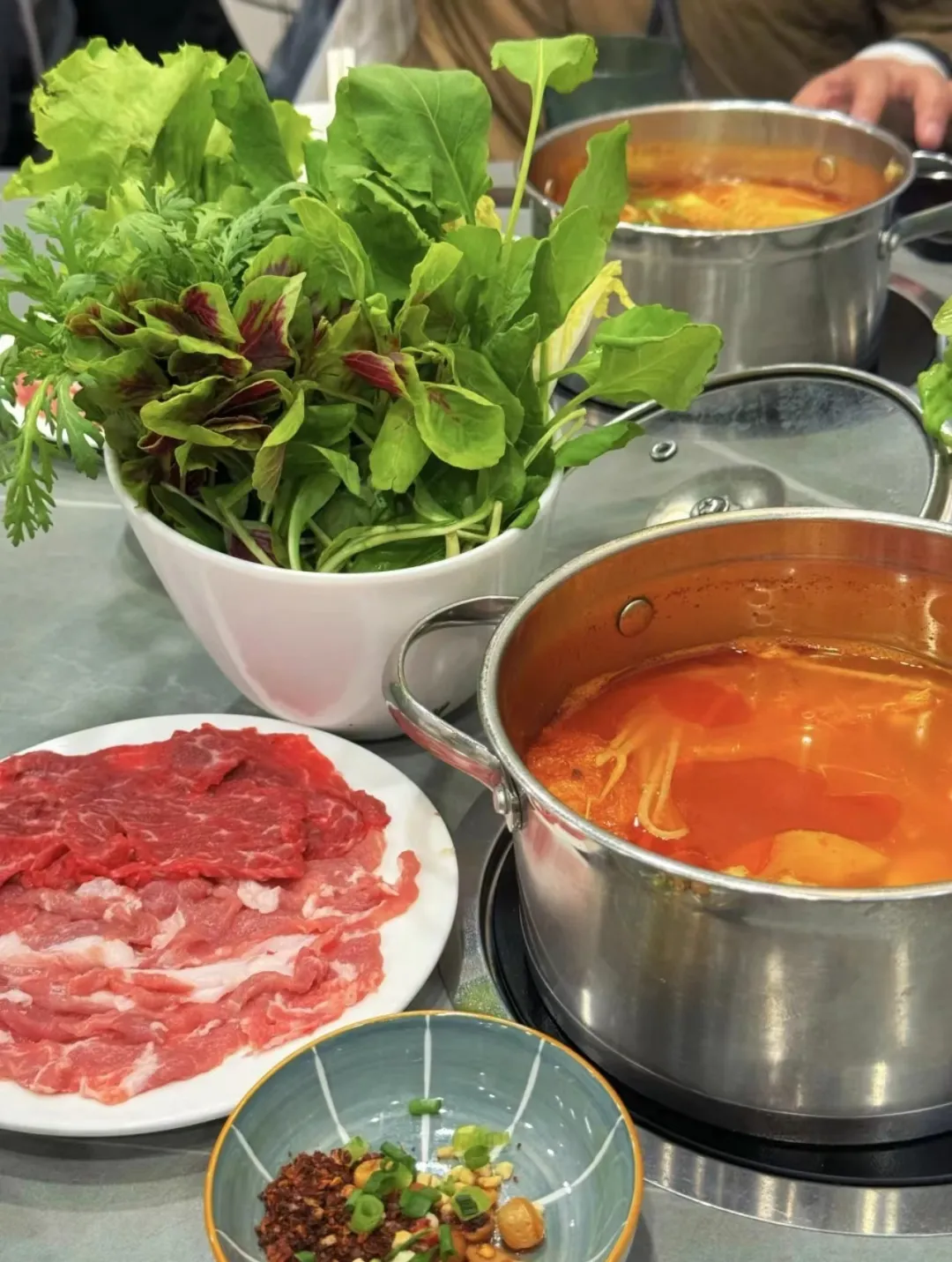 這家小店之所以高人氣,**首先讓顧客體驗到市區的成本,郊區的價格。**鍋底+蘸水+米飯暢吃+蔬菜自助暢吃=15元,其中蔬菜新鮮品種齊全,除了常見的火鍋涮菜,還有豌豆尖、苦菊、花生芽、櫻桃蘿蔔等。