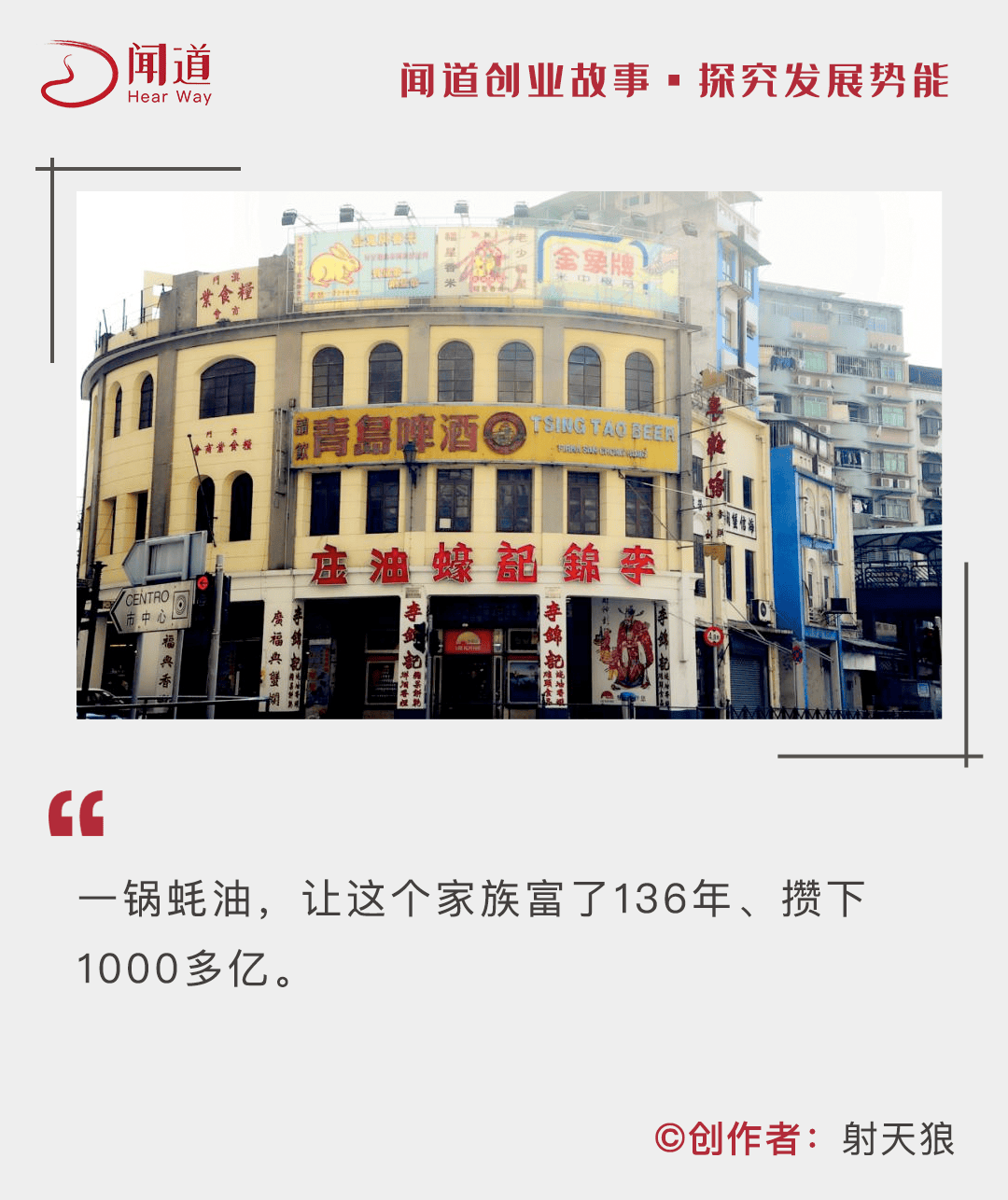 1988年,李錦裳靠一鍋燒焦的蠔油開啓頗為傳奇的創業史,李錦記正式誕生。1902年,一場大火燒掉了老店,40歲李錦裳舉家遷至澳門,在澳門新馬路611號再次掛起“李錦記”的招牌。20年後,李錦記依靠高端蠔油在澳們打穩地基,後來遷往香港。
