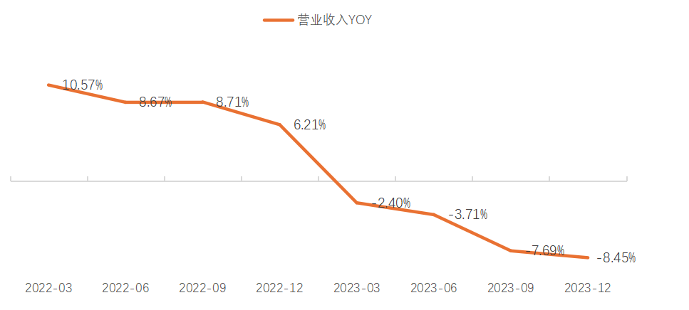 2023年連續三個季度營收負增長,前三季度實現營收1276.34億元,同比下降7.69%。