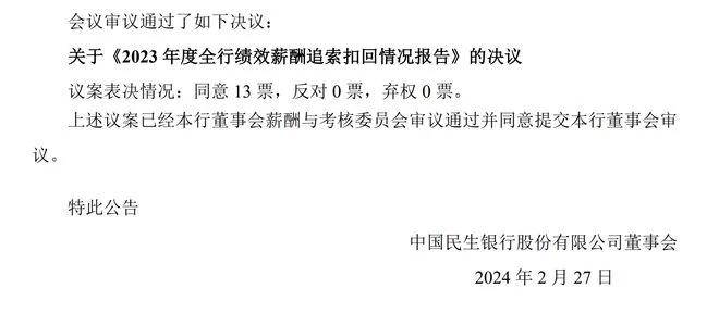 銀行等金融機構向員工“反向討薪”並不鮮見。在2月底,民生銀行發佈公告稱,公司董事會審議通過了《2023年度全行績效薪酬追索扣回情況報告》(下稱《報告》)。這也是今年上市銀行首份公開提到的薪酬追索扣回報告。