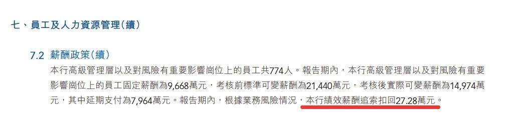 同在港股上市的天津銀行,也首度在財報中披露其績效薪酬追索扣回具體金額。