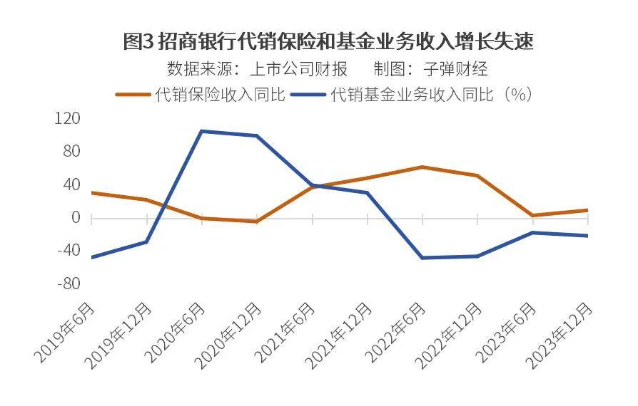 數據直觀顯示出,招商銀行代銷保險、代銷基金這兩類財富業務已經告別了高增長時代。2023年年報顯示,招商銀行代銷保險、代銷基金業務分別錄得135.85億元和51.79億元的收入。保險代銷收入同比增速從35%—60%的水平回落到9.33%,基金代銷收入更是已經開始同比縮減。