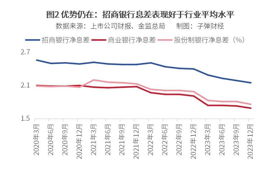 幸而,從淨息差的表現來看,招商銀行的表現仍好於行業平均水平。2023年報顯示,招商銀行淨息差從年中的2.23%縮減到2.15%。雖然是繼續承壓,但從絕對值來看,仍高於金監總局公佈的商業銀行和股份制銀行2023年淨息差,即1.69%和1.76%。
