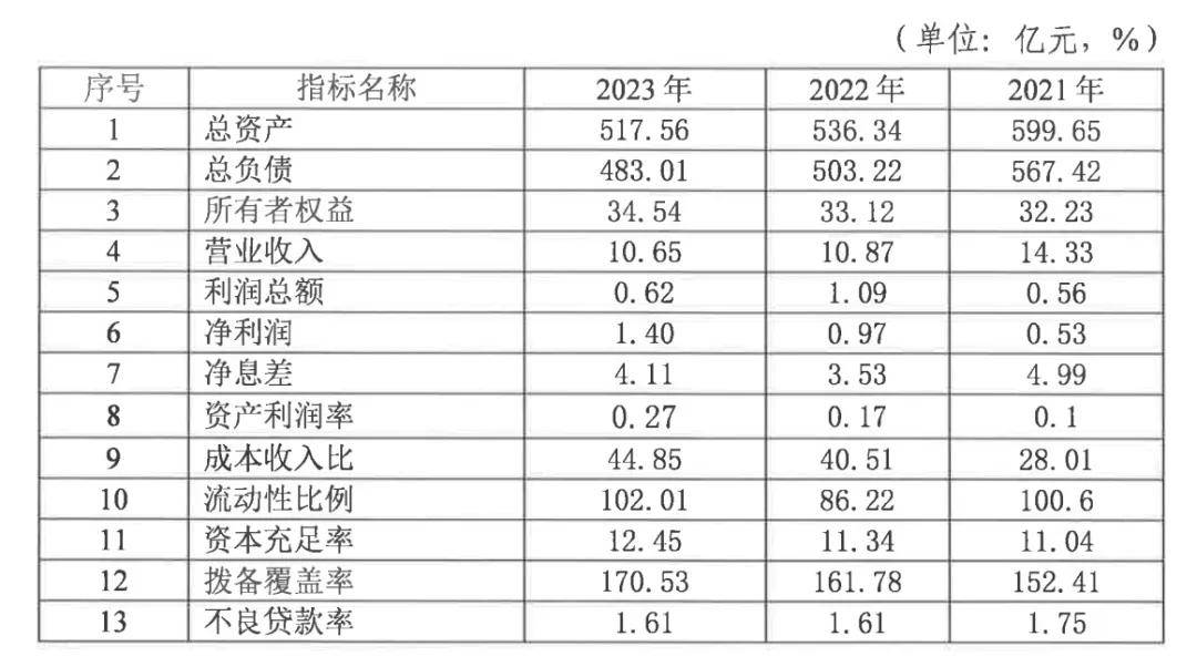 財報數據顯示,2021年-2023年,億聯銀行總資產599.65億元、536.34億元、517.56億元,營業收入14.33億元、10.87億元、10.65億元,淨利潤0.53億元、0.97億元、1.4億元。