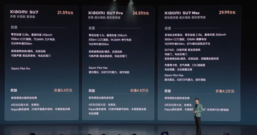 先説最關心的價格,這次小米SU7發佈了三個版本,標準版21.59w,pro版24.59w,以及**max版29.99w。**整體控制在30w以內,具體配置如下圖:
