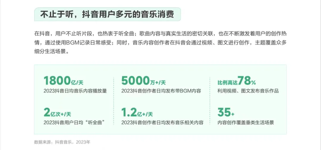 音樂內容上,除了大眾耳熟能詳的熱門內容ost助推,抖音也成為了音樂作品宣推的核心陣地,根據《白皮書》,2023全年共有80多萬首新歌在抖音上線。具體來看: