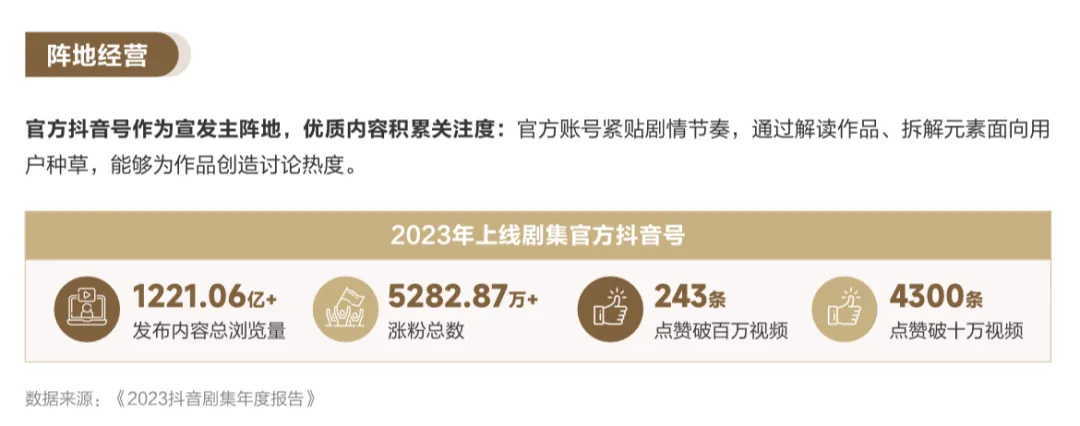 陣地經營上,官方抖音號加明星賬號的合作,搭配上主創團隊直播創新玩法,在影視劇綜內容熱播期間,為內容建起來了快速分發的源頭矩陣。