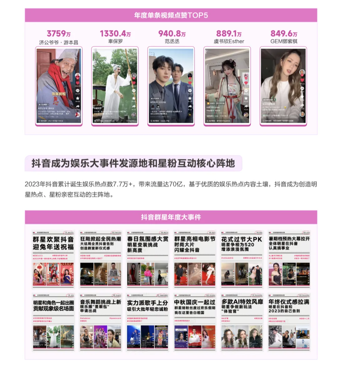 這也帶動了抖音娛樂內容的持續性產出,2023年抖音累積誕生娛樂熱點數7.7萬+,帶動70億曝光。年度明星相關的熱點話題與玩法有很多都誕生於抖音。例如,顯眼包詞條、仿妝以及各種花式挑戰與名場面。