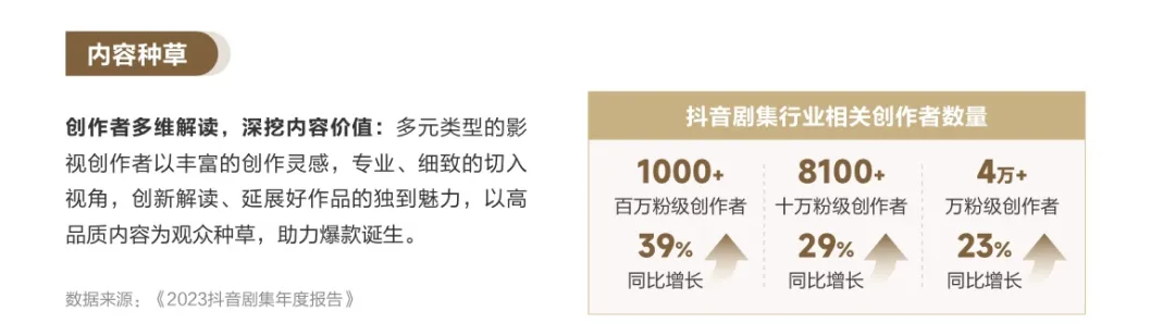 總結來看,娛樂行業目前幾乎所有內容品類,包括熱門風口微短劇、短劇類目,從前期拍攝路透、開播上映前的預熱、到在映在播期間的宣發等等。每一環節,抖音多維度深度參與,充分發揮生態優勢,為行業帶來了內容營銷、運營的新模式探索。