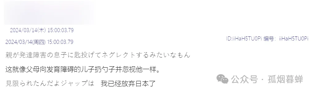 “就像父母對發展障礙的兒子失去了耐心,進而忽視他一樣。日本已經被中國放棄了。”