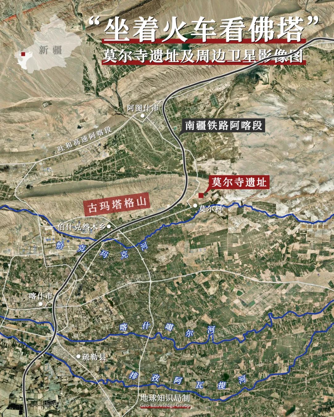 十分巧合的是,南疆鐵路阿喀段在建設過程中,為了避開古瑪塔格山,向東蜿蜒繞行,正好來到了莫爾寺遺址附近。也是因此,才能出現“坐着火車看佛塔”的景象。