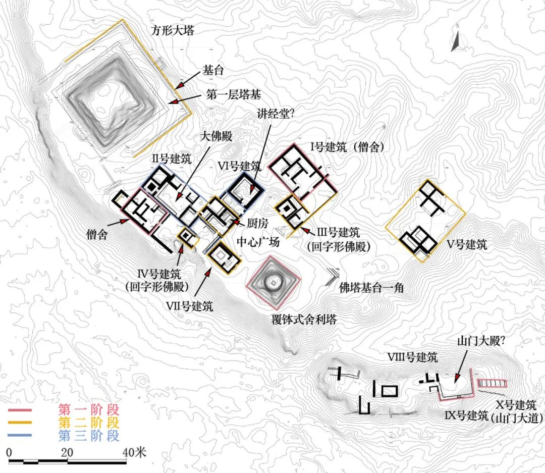 覆缽式舍利塔是遺址最早修建的建築之一,位於建築區的中心,以其為基點,佛寺於北、東、南三面陸續增建和擴建,大體可分為早期、中期、晚期3個階段。