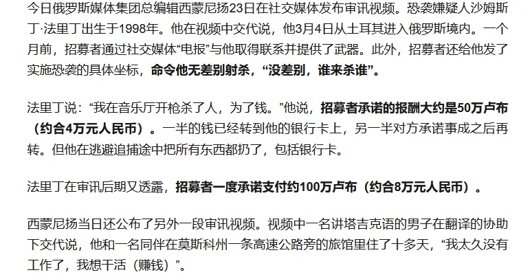 後續各方面爆出的信息也進一步佐證了恐怖襲擊背後的輿論趨勢——**沒有任何人願意負責,所有人都在撇清關係,**連被捕的恐怖分子,都聲稱自己只是“賞金獵人”,既不是為了某個政治目標,也不是為了宣傳某種理念,僅僅是為了不知名的客户的佣金而已。