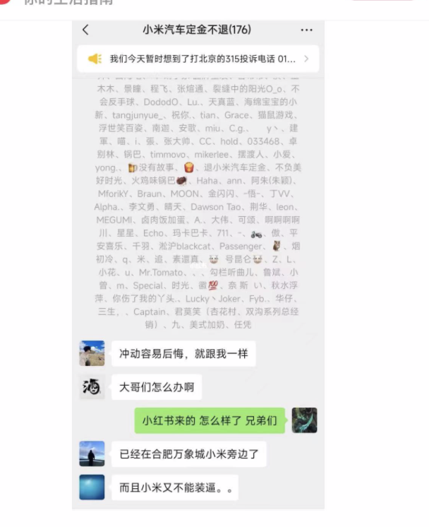隨後,第二波熱度接踵而至,很多下單曬完朋友圈的消費者發現,由於鎖單所以定金沒法退了,於是乎就在小米汽車上市的第二天,維權羣比交付羣更早的出現了。